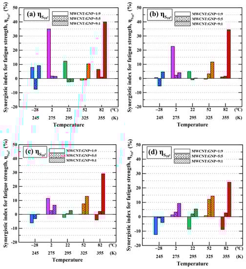 Figure 10a–d shows the variation of the synergistic indexes η for the fatigue strengths S103, S104, S105, and S106, respectively. In general, the specimens with the MWCNT:GNP ratios of 1:9 and 9:1 display higher synergistic effects on the fatigue strengths than those with a MWCNT:GNP ratio of 5:5. The synergistic effect on the fatigue strength for the specimen with a MWCNT: GNP of 1:9 increases with the temperature when the temperature changes from to −28 to 2 °C. When the temperature is higher than 22 °C, the synergistic effect on fatigue strength for the specimen with a MWCNT: GNP of 1:9 begins to decay. The specimen with a MWCNT: GNP of 9:1 displays higher synergistic effect on the fatigue strength with increasing temperature when the temperature is higher than room temperature. Moreover, under all test conditions, the nanocomposites with a MWCNT:GNP ratio of 9:1 have the highest synergistic index of 40% on the 103-cycle fatigue strength at 82 °C. It is deduced that the high temperature and high applied load facilitate the plastic deformation of polymer matrix, further altering the relative directions of nano-fillers to those beneficial to load transfer.