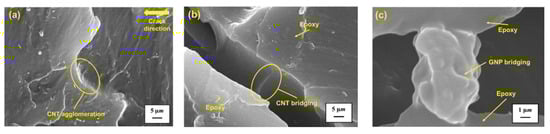 (a) SEM micrograph of crack deflection effect observed for the studied nanocomposite specimen with a MWCNT:GNP ratio of 9:1 tested at 2 °C (magnification 10,000×); (b) SEM micrograph of M WCNT bridging for the studied nanocomposites with a MWCNT:GNP ratio of 9:1 observed at 52 °C (magnification 10,000×); (c) SEM micrograph of GNP bridging for the studied nanocomposites with a MWCNT:GNP ratio of 1:9 observed at 52 °C (magnification 30,000×).