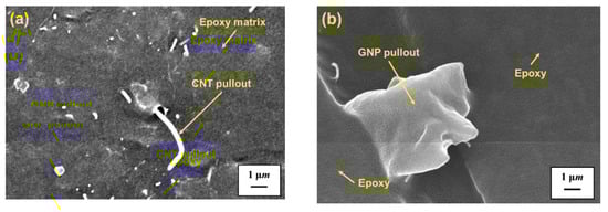 (a) SEM image of pullout of MWCNTs for the nanocomposite with a MWCNT:GNP ratios of 9:1 obtained in the fatigue tests performed at 82 °C (magnification 30,000×); (b) SEM image of pullout of GNPs for the nanocomposite with a MWCNT:GNP ratios of 1:9 obtained in the fatigue tests performed at 82 °C (magnification 30,000×).