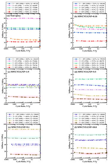 Temperature-dependent variation of specimen stiffness with the cycle ratios for the example nanocomposite specimens with the MWCNT:GNP ratios of (a) 0:0, (b) 0:10, (c) 1:9, (d) 5:5, (e) 9:1, and (f) 10:0.