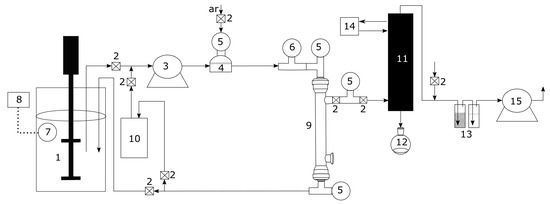 Figure 1. Schematic of the pervaporation experimental setup used in the study. (1) vessel, (2) valve, (3) peristaltic pump, (4) pulse damper, (5) pressure gauge, (6) vacuum gauge, (7) temperature sensor, (8) temperature controller, (9) membrane and module, (10) vessel, (11) Jacket Dimroth condenser, (12) product trap, (13) safety trap, (14) thermostatic bath, (15) vacuum pump.