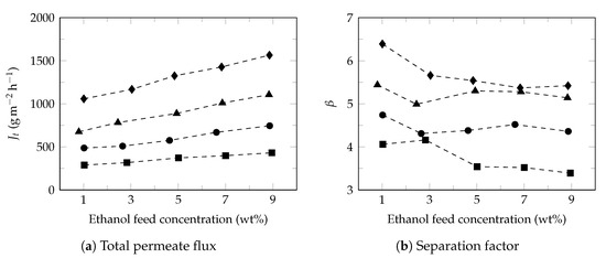 The results are consistent with the characteristics of the membrane reported by the provider (500–1000 g m 2 h 1 , separation factor of 6; ethanol 5 v % , 5–10 mbar) and are consistent with the literature [57]. As observed in Figure 2a, total permeate flux increased with both ethanol concentration and temperature, while the separation factor showed a slight drop with increasing of ethanol feed concentration and increased with temperature. The observed total flux performance and the decrease in separation factor in PDMS membrane are well known [58]. However, the increases in the separation factor with the increase in feed temperature is a phenomenon that is not always observed (Figure 2b). On some occasions the separation factor tends to decrease [59] as a consequence of the loss of the hydrophobic character of the membrane, largely attributed to membrane swelling. Studies carried out by Wang et al. [60] show that the temperature can affect in a lesser degree, the swelling of PDMS membrane when compared to the effect produced by the ethanol feed concentration. It was observed small increases in the separation factor with increasing temperature and decrease of separation factor with increasing of ethanol feed concentration.