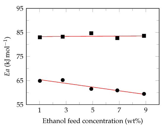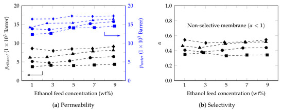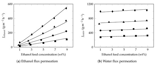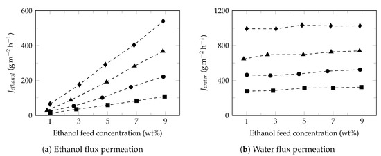 Figure 4 shows the effect of ethanol feed concentration on the ethanol (Figure 4a) and water (Figure 4b) fluxes at different temperatures. Under these conditions, ethanol flux increased proportionally with increasing of ethanol feed concentration while the water flux presented a slight increase, as reported in the literature [68]. Studies have shown that increasing the ethanol feed concentration normally result in the increase of swelling degree of membrane, free volume of membrane [60], partial pressure [69] and improves the affinity of ethanol to membrane [70]; increasing the driving force and consequently the ethanol flux in permeate. Moreover, the small diameter of water molecules facilitates its transport through the free volume of membrane observing higher water fluxes with approximately constant behaviors [71]. Furthermore, the slight increase in the water flux permeate led to a decrease in the separation factor (Figure 2b), as reported in the literature [72].
