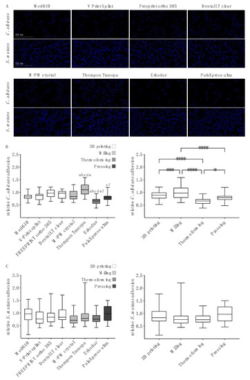 For S. mutans adhesion, there were no significant differences between the resins (Figure 1C, left) or between the manufacturing methods (Figure 1C, right).