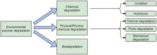 Polymers belong to the most frequently used classes of biomaterial because their properties may be modified as required by various additives, depending on a particular biological application [4]. Degradation of polymers may be induced by thermal activation, oxidation, photolysis, radiolysis, or hydrolysis (Figure 1). If the degradation is affected by the biological environment, it may also be referred to as biodegradation [5]. A plasticiser content may affect the degradation of a material. In a study performed by Pelegriny et al., they used the same type of a plasticiser as that used in the present study; it may be stated that triacetin inhibits the PLA degradation up to 45 days after the exposure, and afterwards it no longer influences the degradation process [6]. Similar results were obtained by Darabian et al.; in their study, they examined two different plasticisers. As to the absorption, the results clearly showed that a similar phenomenon has been observed in the samples containing polylactic acid (PLA) and TAC, in particular that the water absorbency increases with an increasing TAC [7].