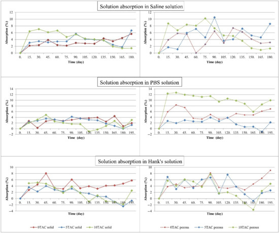 An increase in the weight of each specimen immersed in a solution was directly proportional to an increase in the absorption. The graphs in Figure 2 show a gradual increase in the absorption of the solutions. The absorption by porous specimens immersed in SS was significantly higher than the absorption by solid specimens immersed in the same solution. The average value of absorption by solid specimens was 3.8076%, while the average value of absorption by porous specimens was 5.1966%. A difference in the absorption values was also reflected in the ratio of a plasticiser content to the basic PLA/PHB material. In these specimens, the absorption of the solution increased with an increasing concentration of a plasticiser. Out of all specimens, the highest absorption value was observed in the porous specimen made of PLA/PHB 5TAC, i.e., 10.495%. The lowest absorption of SS (0.027%) was observed in the porous specimen made of PLA/PHB 0TAC.