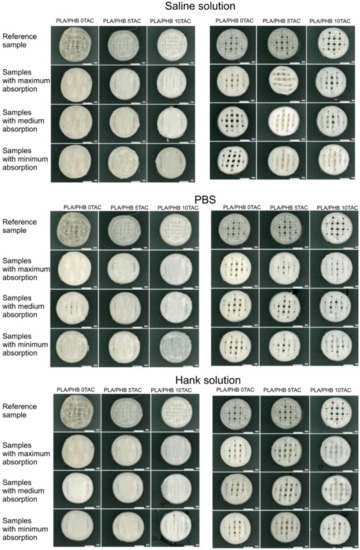 Degradation of specimens was also confirmed in one more aspect. As there were three types of material and three types of solution, it was assumed that each material may behave differently in a different solution, even after a specimen is taken out of the solution. In our case, the solid specimens made of PLA/PHB 0TAC which were immersed in the saline solution and the solid specimens made of PLA/PHB 10TAC which were immersed in PBS exhibited the formation of block cracks and bubbles (Figure 5D). These changes were not visible while the specimens were still immersed in the solutions. After they were taken out and dried, their surface exhibited some block cracks and bubble-like lighter areas visible to the naked eye.