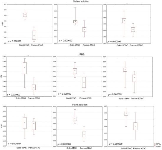 As for the evaluation of the effects of a plasticiser, it focused on the effects of the plasticiser contained in a material on identical solutions and identical specimen shapes; the total number of the performed tests was 6. The evaluation of the effects of a plasticiser was carried out using the Kruskal–Wallis test, which confirmed again that the plasticiser (0%, 5%, and 10%) affected the changes in individual weights. No statistically significant differences were observed for the porous specimens made of PLA/PHB 0TAC or PLA/PHB 10TAC which were immersed in SS; or for the porous specimens made of PLA/PHB 0TAC or PLA/PHB 5TAC which were immersed in PBS. However, statistically significant differences were observed for this particular solution in all solid specimens immersed in PBS. As for the solid specimens made of PLA/PHB 0TAC or PLA/PHB 5TAC which were immersed in HS and the porous specimens made of PLA/PHB 5TAC or PLA/PHB 10TAC which were immersed in HS, there were no statistically significant differences.