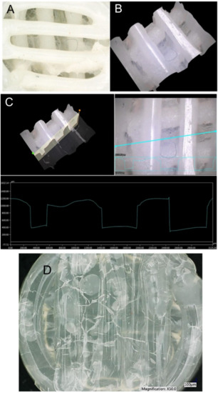 In terms of morphological changes, the focus of the monitoring was on the changes in the surface of the individual specimens and on the changes in the width of the extruded fibres. The most significant change in the fibre width was observed in the solid specimens made of PLA/PHB 0TAC, which exhibited a fibre width after degradation as low as approximately 1 mm. An increased fibre width was observed in the porous specimens made of PLA/PHB 0TAC; this material did not contain a plasticiser and was immersed in all three solutions. The only negative value, i.e., a decrease in the fibre width, was observed in the porous specimen made of PLA/PHB 5TAC, which degraded in SS (Table 3). This decrease in the fibre width might have been caused by the fact that the specimen lost its porosity after degradation because a film of a material was formed in its lower layer. This film was probably formed from a certain portion of the material released from the individual fibres of the specimen, and that is why the width of the fibres decreased. A macroscopic image of the specimen shows a visible film formed in the lower part of the specimen (Figure 5A). A 3D image of the central part was subsequently used to create the cross-sections of individual parts (Figure 5B). The graph represents the development of the surface. If the specimen was porous and with no film, the lower value in the graph would be 0 μm. However, this graph of the surface development confirms the presence of the film at the height of approximately 400 µm (Figure 5C).