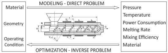 Direct (modeling) and inverse (optimization) problem for polymer extrusion: L, D, t, φ, h—screw geometry parameters, N—screw speed, Q—flow rate, T—temperature conditions, V—velocity.