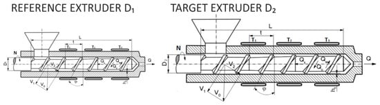 The concept of scaling-up for polymer extrusion: D1—reference screw diameter, D2—target screw diameter.