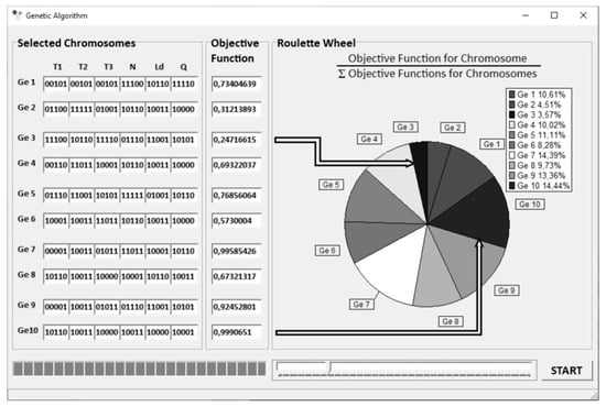 The “roulette wheel” method was applied for selection [68]. A scheme of operation of “roulette wheel” is depicted in Figure 5. The surfaces of “roulette wheel” assigned to individual genotypes are proportional to the values of the objective functions produced by these genotypes. For example, the Ge10 genotype produces the highest value of the objective function Fobj = 0.9991, and covers an area on the “roulette wheel” equal to 14.44% of its total area. However, the Ge3 genotype produces the smallest value of the objective function Fobj = 0.2472, covering an area equal to 3.57% of the total area of the “roulette wheel”. The Genetic Algorithms parameters are depicted in Figure 6.