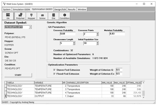 In the study [68], the optimization task of setting the operating conditions and screw design has been presented to maximize the extrusion output and minimize the specific energy consumption defined by the power consumption/extrusion output ratio. The optimized parameters were the screw speed, the three barrel temperatures, and the length of the screw metering section. The extruder output was both the parameter to be optimized and the optimization criterion, since maximizing it was desirable regardless of the fact that it is described by the feeder. The global objective function was defined as the weighted sum of the individual criteria (Equation (1)). The values of optimized parameters for computation of the global objective function were selected randomly. The starve fed or flood fed modes of feeding were also selected randomly.