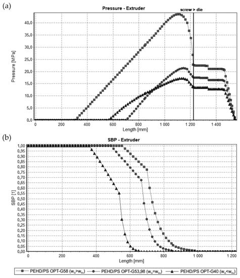Simulations for starve fed extrusion at optimal process parameters for various weights of optimization criteria wQ and wEs (adapted from [68]: (a) pressure profiles, (b) melting profiles (SBP, i.e., solid bed profile).