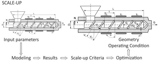 An important method of designing in the polymer processing is the process scaling, i.e., changing the scale of the process according to the specific criteria. Scaling consists in changing the process, e.g., increasing the process efficiency, while maintaining the scaling parameters at a level that is as close (similar) to the reference process parameters as possible. Thus, it consists in minimizing the differences between the parameters characterizing the reference process and the resulting process. The basis of this concept is the theory of similarity, which determines the relationships between the physical parameters that affect the phenomenon under study (e.g., fluid flow). Meeting these dependencies ensures that the similarity between two systems of different sizes is maintained. The concept of scaling-up for polymer extrusion is depicted in Figure 2.