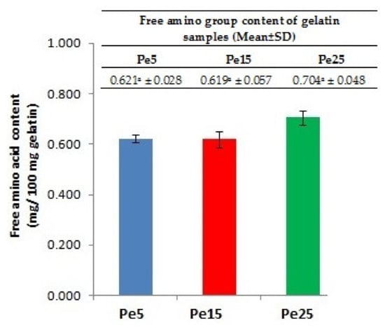 The results for the amino group content in the different gelatin samples are shown in Figure 2. The higher free amino acid content in Pe25 compared to Pe5 and Pe15 correlated well with the SDS-PAGE image, which revealed extensive degradation of proteins molecules resulting in only smear band. The higher level of pepsin used in Pe25 extraction might have led to severe degradation of protein chains, resulting in higher amount of free amino acids in Pe25. Increasing amount of free amino group was found in the gelatin sample extracted at high temperature due to cleavage of proteins [24]. Similarly, higher free amino groups were detected in gelatin samples extracted using ultrasound and longer time duration [32].