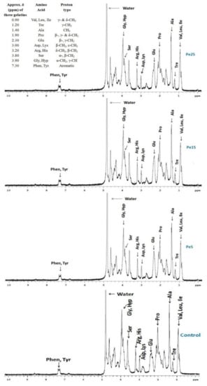 The proton NMR spectra for control, Pe5, Pe15, and Pe25 gelatins are represented in Figure 3. The spectral pattern exhibited the typical chemical environments undergone by various protons from the amino acid side chains when they were exposed to radio waves. Assignment of bands in the spectra were performed following the research articles published by Uriarte-Montoya et al. [40] and Voron’ko et al. [41] and correlated well with the amino acid composition discussed above.