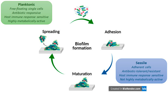 Bacteria may exist in a planktonic state (free-floating) and sessile state (adhered to a surface), exhibiting very distinct features [45]. Planktonic bacteria rapidly multiply and have high motility. Therefore, they are more susceptible to the effects of antibiotics, environmental (i.e., UV light, desiccation, heat, cold, shear forces), and host factors. Conversely, sessile bacteria grow very slowly on surfaces for nutrient limitations and limited mobility. However, they can elude antagonistic factors by forming aggregates, altering their physiology, and taking advantage of deficiencies in the host clearance mechanisms to cause infection [45].