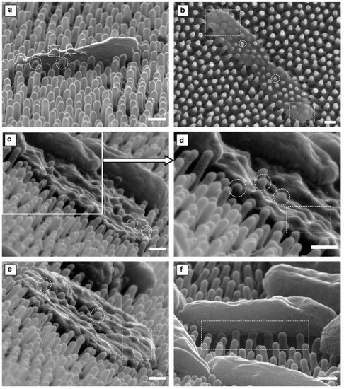 Surface nano-patterning was inspired by several examples of natural antifouling surfaces, such as lotus leaves, cicada, and dragonfly wings. In light of this, precise surfaces have been patterned with nanostructures (i.e., ordered stripes, pits, pillars, or squares), differing in size, height, width, depth, and spacing. These nanopatterned surfaces have proved their antifouling and/or killing effectiveness versus Streptococcus/Staphylococcus spp. and P. aeruginosa by inducing physical deformation. In this regard, Velic and co-workers demonstrated, through a biophysical modelling approach, the mechanics of P. aeruginosa interaction and death on nanopatterned P. claripennis cicada wing. Their results suggested that higher depth pillar tips created a critical site at the pillar apex, resulting in penetration through the bacterial envelope with a following partial (Figure 2a) or total (Figure 2b–e) loss of turgor; while lower depth pillar tips resulted only in a perturbation of the bacterial body (Figure 2f) [68].