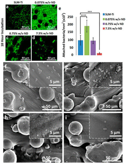 S. aureus adhesion and growth on nanodiamond (ND)-coated selective laser melted titanium (ND) substrata (ND-SLM-Ti). Live/Dead staining of S. aureus growth on (a) uncoated SLM-Ti, (b) 0.0075% w/v ND, (c) 0.75% w/v and (d) 7.5% w/v ND-coated SLM-Ti substrates after 18 h of incubation. (e) S. aureus density on the uncoated SLM-Ti and SLM-Ti coated with 0.075–0.75–7.5% w/v ND quantified from Live/Dead fluorescent images after 18 h of incubation. The S. aureus density is expressed as average cell number per mm2 and indicated as mean ± standard deviation, n = 3. p < 0.01. SEM micrographs of S. aureus adhesion on (f) uncoated SLM-Ti, (g) 0.0075% w/v ND, (h) 0.75% w/v and (i) 7.5% w/v ND-coated SLM-Ti substrates after 18 h of incubation (Mag. 1000×, scale bar 50 µm; insert Mag. 30,000×, scale bar 5 µm). Reprinted and adapted with permission from [73]. Copyright 2021, American Chemical Society.