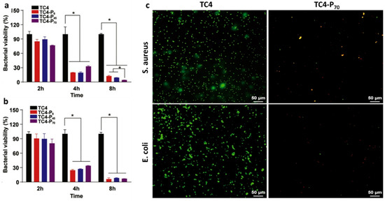 Polycationic polymers, such as CS and QACs, have caught the attention of many researchers owing to their inherent pathogens’ contact-killing capability. CS has been widely used for its antibacterial features, even if the precise mechanism is yet to be fully understood. Two main hypotheses have been suggested: (i) positively charged CS might interact with negatively charged microbial cell surfaces, altering membrane permeability, inhibiting DNA replication and RNA synthesis and leaking of cellular contents; (ii) CS could act as a chelating agent, binding trace metal elements and causing toxin production with resultant microbial growth inhibition [79]. A polylactide-co-glycolide hydroxyapatite 3D-printed scaffold grafted with a quaternized chitosan-(PLGA/HA/HACC) exhibited outstanding antimicrobial efficacy versus MSSA and osteoconductive properties in repairing infected cortical and cancellous bone defects in rat and rabbit in vivo models [80]. QACs are cationic surfactants, with long alkyl groups and quaternary ammonium groups, well known as disinfection agents. QAC antimicrobials are long-lasting contact-based antibacterial agents, effective against both Gram-positive and Gram-negative, including multidrug-resistant strains, fungi, and certain classes of viruses [81]. Their antibacterial activity lies on the positively charged quaternary amine N+, which changes the ionic balance of the bacterial cell (i.e., sodium (Na+), potassium (K+), Mg2+, Ca2+), disrupting the membrane [82]. Recently, a novel phosphonate/quaternary amine block polymer (pDEMMP15-b-pTMAEMA70) coating of Ti alloy plates (TC4-P70) exhibited an antibacterial rate of 95.8% of S. aureus and 92.9% of E. coli cells attached, as shown in Figure 4 [83]. Meanwhile, Bouloussa et al. assessed an N+/N ratio-dependent killing activity of quaternized polyvinylpyridine-grafted (Q-PVP) Ti plates against MRSA [84].
