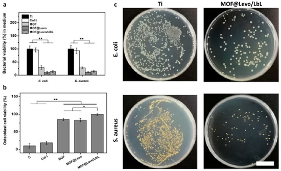(a) E. coli and S. aureus viability in culture medium after incubation with Ti, Col I, MOF, MOF@Levo and MOF@Levo/LBL surfaces; (b) osteoblasts viability on Ti, Col I, MOF, MOF@Levo and MOF@Levo/LBL surfaces in a co-culture model (n = 6, * p < 0.05, ** p < 0.01); (c) pictures of re-cultivated E. coli and S. aureus colonies on LB agar plate after incubation with Ti and MOF@Levo/LBL surfaces (scale bar 2 cm). Reprinted from The Lancet, [92], copyright 2021, with permission from Elsevier.