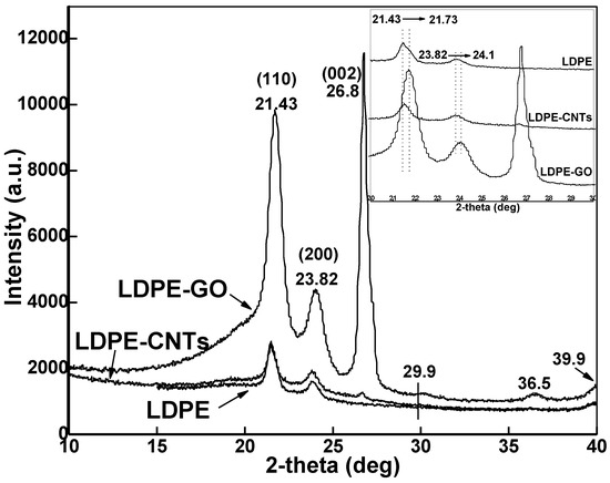 A magnified version of XRD patterns (INSET) provides better observation of the peak shift. A slight shift towards a higher 2-theta value in the XRD peak for LDPE was observed from 21.43° to 21.73° in the specimen with GO, which is reflective of penetration of LDPE chains inside nanoplatelets of GO and the resultant exfoliation of the GO layers [31]. On the other hand, no change was observed for LDPE-CNTs, which is indicative of intact tubular structure of CNTs. The peak shift from 21.43° in pure LDPE to 21.73° in LDPE-GO is indicative of conversion of triclinic to orthorhombic form. Further, small peaks at 29.9, 36.5°, and 39.9° are also due to the (210), (020), and (011) diffraction peaks of orthorhombic LDPE, respectively [32].