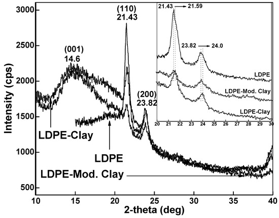 The XRD patterns of LDPE-clay nanocomposites are shown in Figure 4 with two sharp peaks at 21.43° and 23.82° from LDPE. A broad peak at 2θ = 14.6° was found, which is attributed to clay and modified clay. X-ray scans of LDPE-clay and LDPE-modified clay nanocomposites have peaks similar to the pure LDPE but shifted to a higher 2θ representing a larger d-spacing. The peak shift indicates that the nanofiller gallery (space between layers) has expanded and it is generally assumed that the amorphous polymer matrix has intercalated the nanostructure [33,34].