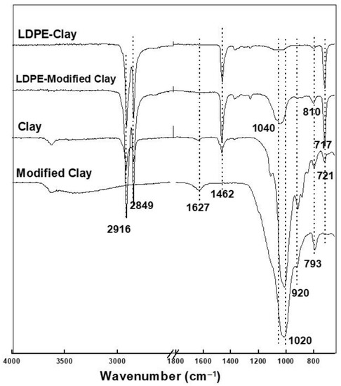 The FTIR spectra of pure clay, modified clay, and their LDPE nanohybrids are given in Figure 7. The peak at ~3650 cm−1 is assigned to the hydroxyl (-OH) group of moisture in the clay, while the peaks at 1627 and 1020 cm−1 are due to -OH deformation of water (H-O-H bending mode) and Si-O stretching vibrations in clay.