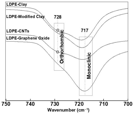Figure 8 shows the FTIR spectra of methylene rocking vibrations (from 750–700 cm−1) of LDPE crystallized with various nanofillers. An intense absorption at 717 cm−1 was found for all of the samples. This indicates that PE in all the cases is predominantly monoclinic. However, a small absorption band at 728 cm−1 was found in LDPE-CNTs and LDPE-clay, which is due to small fraction of orthorhombic content. The peak shift also suggests a decrease in crystallinity in LDPE-CNTs and LDPE-clay, which is in agreement with the crystallinity data obtained using XRD.