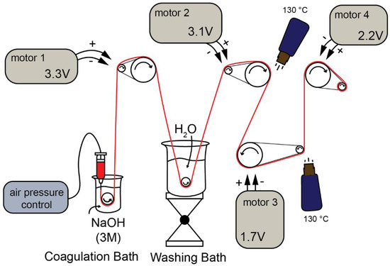 In Figure 1, the setup to obtain CHI/CNF fiber yarns by gel spinning is schematized. It consisted of a syringe barrel of 30 mL, which contained the CNF-filled CHI viscous suspension (or CHI viscous solution), connected to a controlled air-pressure clip of a Performus I Nordson EFD dispenser connected to compressed air. The syringe was connected to a conic needle with a tip diameter of 0.58 mm (gauge 20, pink, Nordson EDF). The CHI/CNF viscous extrudate enters the coagulation bath (3M NaOH), which surface was located at a distance of ~2 mm from the needle tip. A ceramic bobbin roller (V-shape pink ceramic diabolo, Petit Spare Parts, Aubenas Cedex, France) was immersed in the coagulation bath, on which the coagulated hydrogel macrofilament is pulled out with the aid of a DC motor, which rotation speed (Table 1) is controlled by the input voltage fixed by the power supply (BaseTech BT-153, Hamburg. Bermany) (Figure 1). Afterward, the hydrogel macrofiber passed through a washing bath of deionized water, where another ceramic roller was immersed, from which the macrofiber was stretched and pulled out by the spinning motor 2. A spinning motor 3 and a spinning motor 4 allowed the further stretching of the fibers, their drying and finally their collection on a bobbin. The summary of the linear bobbin speeds supported by the different motors is related in Table 1. The drying of the fiber is a critical step and was supported by heat guns placed in the setup near the spinning motors 3 and 4, allowing heating at 130 °C. The spinning setup runs for 10 min, which yields fibers of around 25 m in length. After preliminary works dealing with the preparation of viscous CHI solutions and CHI/CNF suspensions of varied CHI and CNF compositions, the appropriate range of concentrations of the constituents was fixed to achieve the stable spinning of CHI/CNF systems. Composite fibers of CHI/CNF were processed through gel spinning of viscous collodions of a given CHI concentration of 4 wt %, with varied CNF contents of 0.2, 0.3, 0.4 and 0.5 wt %.