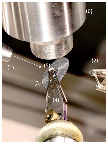 Photograph of the fiber sample holder used for X-ray scattering analysis in transmission mode in the Gemini A Ultra diffractometer. (1) X-ray delivery tube (CuKα), (2) two-well beamstop, (3) lead washer shield, (4) elastic pliers (collected from a 3.25″ hard disk), (5) sample, (6) cryostat nozzle (courtesy of Ruben Vera, Centre de Diffraction Henri Longchambon, University Claude Bernard Lyon 1, University of Lyon, France).