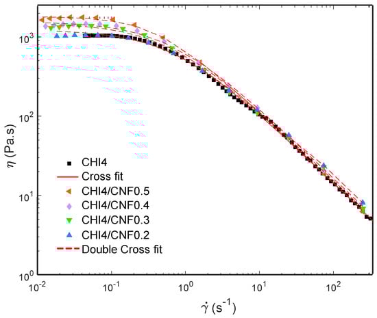 where η0 is the Newtonian or zero-shear viscosity, p is equal to 1-n with n being the flow behavior index, and τ is the relaxation time for polymer chain disentanglements. Similar rheological behavior was observed for the suspension containing the lowest CNF content of 0.2 wt %. Then, the CNF-filled CHI viscous suspensions with increased CNF concentration exhibited more complex flow diagrams, with higher Newtonian viscosities measured in the low shear rate range (), which was more evident for the highest CNF contents and a shear-thinning occurring in the higher shear rate regime (Figure 3). Thus, a double Cross law (Equation (2)) could model the two-step flow diagrams of the CHI/CNF suspensions with CNF contents beyond 0.2 wt % [15]: