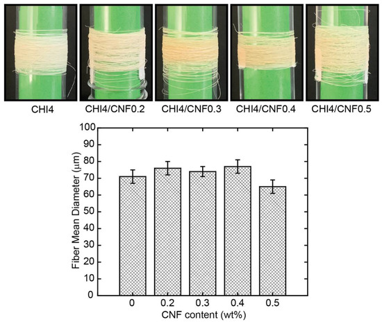 (Top) Photos of the obtained CHI/CNF spun fibers of varied compositions. (Bottom) Histogram showing the mean CHI/CNF fiber diameter obtained with the different CHI/CNF collodion formulations.