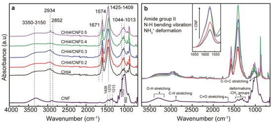 (a) ATR-FTIR spectra of CHI/CNF spun fibers, with the reference spectrum of the CNF alone. (b) Closer view to the amide II band region around 1550–1650 cm−1, after comparison of all FTIR spectra as in (a).