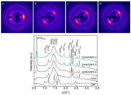 (Top) Two-dimensional wide-angle X-ray scattering (2D-WAXS) images of the spun CHI/CNF fibers of (a) CHI4, with vertical fiber axis; (b) CHI4/CNF0.2, (c) CHI4/CNF0.3 and (d) CHI4/CNF0.4 with fiber axis tilted by −45° from the vertical position. (Bottom) Radial average over the 360° azimuth of the above 2D-WAXS images of spun fibers of varied CHI/CNF compositions. In the peak indexations, the notations “a”, “Cell”, and “NaAc” refer to the corresponding reflections of chitosan anhydrous polymorph, cellulose I allomorph, and sodium acetate salt crystals, respectively.