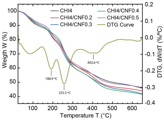 The thermal stability and decomposition patterns of pure CHI and CNF-filled CHI fibers were investigated through thermogravimetric analysis (TGA), as shown in Figure 8. After an initial weight loss of the samples around 100 °C [79], attributed to the desorption of water molecules bound to the hydrophilic polysaccharide structures, the TGA curves of almost all spun fiber compositions (from collodions CHI4, CHI4/CNF0.2, CHI4/CNF0.3, CHI4/CNF0.5) show three thermal degradation steps at around 189, 256 and 403 °C. The weight loss at 189 °C might correspond to the degradation of losing chitosan polymer chain ends or possible produced oligomers as previously reported for this temperature range [79]. Then, the main decomposition of the repeating units of polysaccharides like chitosan and cellulose is observed at around 256 °C [65,79,80]. Afterward, a minor decomposition was observed at ~400 °C, which may correspond to the degradation of remaining sodium acetate, as also suggested from SEM and WAXS analyses. It is worth noticing, for the formulation CH4/CNF0.4, the thermal stability was extended to ~256 °C, at which temperature the first degradation step was observed, in contrast to all other samples, which showed an early decomposition at ~189 °C. For cellulose nanofiber-filled polymer materials, it has been shown that the content of polysaccharide nanofibers in the composite plays a major role in the strengthening effect and thermal properties of the nanofibers [81]. The thermal stability improvement observed for this formulation CH4/CNF0.4 seems to be related to an achieved threshold of concentration of nanoreinforcement, at which the matrix/filler and filler/filler interactions seem to be optimum to positively influence the morphological and thermal properties of the CHI/CNF composite [79], This might correspond to the threshold of CNF content at which a fibril percolation effect should occur with the formation of a network of nanofibers within the polymer matrix, resulting in thermal stabilization of cellulose nanofiber-filled composites [82].