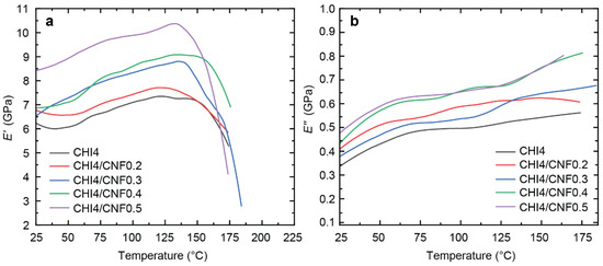 The temperature effect on the mechanical behavior of the CHI/CNF composite fibers was investigated by DMTA. We investigated the influence of filler on possible macromolecular relaxation processes or structural transitions of the materials [83,84]. Figure 9 shows the evolution of the storage modulus E′ and the loss or dissipation modulus E″ with temperature for pure chitosan fiber and CNF-filled CHI composite fibers of varied CNF contents.