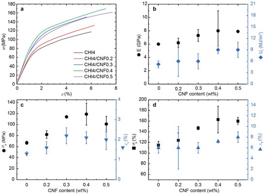 Tensile mechanical properties of spun CHI/CNF fibers obtained for different formulations. (a) Nominal stress–strain curves. Evolution of (b) Young’s modulus E and toughness Ut, (c) the stress (σy) and strain (εy) values at the yield point, (d) the stress (σb) and strain-at-break (εb), with the increase of CNF content.