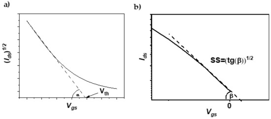 2 were characterized by a relatively high value for SS, showing that the growth dynamic of the current in the subthreshold regime was low. This might be connected with the relatively high density of the traps at the semiconductor–dielectric interface. The shape of the output curves was a closer fit to the model transistor [
