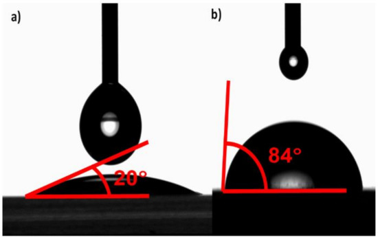 Figure 3b). The contact angle for the bare oxide was around 20°, whereas on the modified surface it increased to 84°. This variation in the contact angle means that the surface coated with BQMI