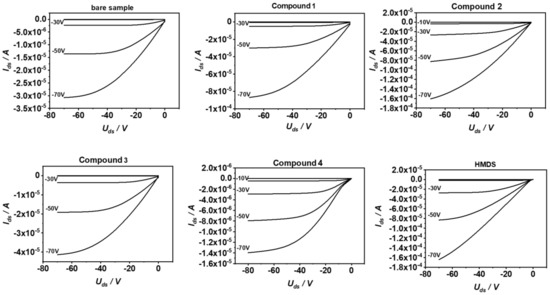 39] in the case of the samples modified by BQMIs as compared to the HMDS-treated sample. The saturation region of the IV output characteristic began at a lower drain voltage, and its linear regime was shorter. The modification of the SiO