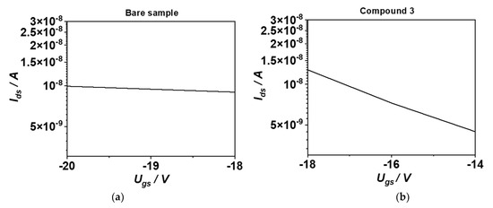 The zwitterions with aromatic side groups (3–4) were characterized by weaker solubility in DMF in comparison to their aliphatic analogues. Their incorporation into the OFET structure as interlayers did not lead to improved charge carrier mobility or increase the current flowing through the transistor channel. In contrast, the coating of bare SiO2 with N-alkyl zwitterionic quinones caused changes to the water contact angle, as observed for compound 3. The modified surface was characterized by a contact angle value of around 84°, compared to 20° before modification. This presumably resulted in better ordering of the DPPDTT molecules in the semiconductor layer and improved the features of the OFET. The charge carrier mobility increased from 0.1 cm2 V−1 s−1 for the bare sample to 0.55 cm2 V−1 s−1 for the sample with the incorporation of zwitterion 1 as an interlayer.