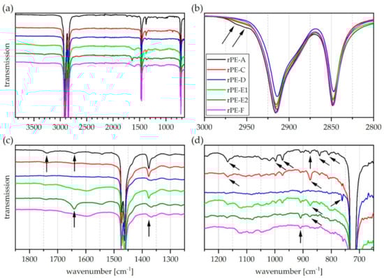 The ATR-FTIR spectra of all rPE materials are depicted in Figure 1. The spectra are presented in a stacked arrangement resulting from arbitrary shifts along the vertical axis to increase visibility. While Figure 1a provides a view of the entire wavenumber range investigated, Figure 1b–d are magnifications of specific regions of interest.