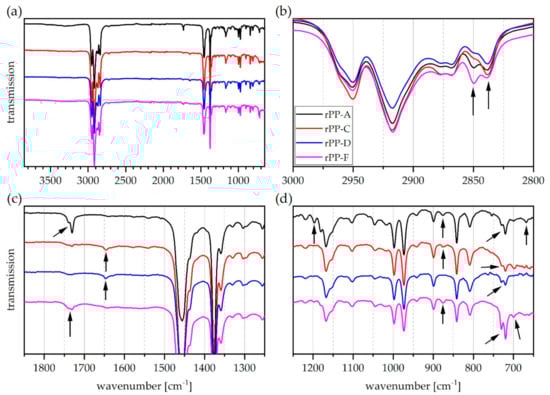 Regarding bands of very low intensity in Figure 2d, it can be said that there is peak at 875 cm−1 (indicating calcium carbonate) in all rPP spectra except rPP-D. Furthermore, the same rPP grades exhibit a very weak single band at 700 cm−1. This band might stem from contamination with polystyrene [,]. A band at 670 cm−1 was detected in the rPP-A spectrum and it seems to appear together with two more bands of low intensity at 1018 cm−1 and 3676 cm−1. This pattern can be assigned to talc [], another common inorganic filler in polyolefin materials. The spectrum of rPP-A contains additional bands at 1197 cm−1 and 1180 cm−1 (see black arrow) that were not found in such clearly visible manner in any other recyclate. These bands could not be reasonably assigned.
