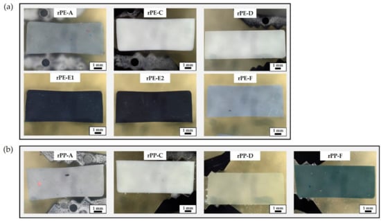 A collection of microscopic images showing polished cross-sections of injection molded specimens of each recyclate grade is provided in Figure 3. The rPE materials are shown in Figure 3a and the rPP materials in Figure 3b. Each cross-section is approximately 4 mm × 10 mm in size. It is evident that the recyclates differ in color. The materials rPE-A, rPE-F, and rPP-A are grey and they contain discrete inclusions of diverse colors, shapes, and sizes. The materials rPE-C, rPE-D, and rPP-C are white and some dark spots can be identified in the rPP-C cross-section only. The material rPP-D is best referred to as natural, perhaps with a yellowish shading but a homogeneous appearance, while rPP-F contains numerous inclusions and its overall appearance is a mix of dark colors. The materials rPE-E1 and E2 are the only black recyclates in this work. No inclusions are visually detectable in these grades at the magnification chosen for Figure 3.