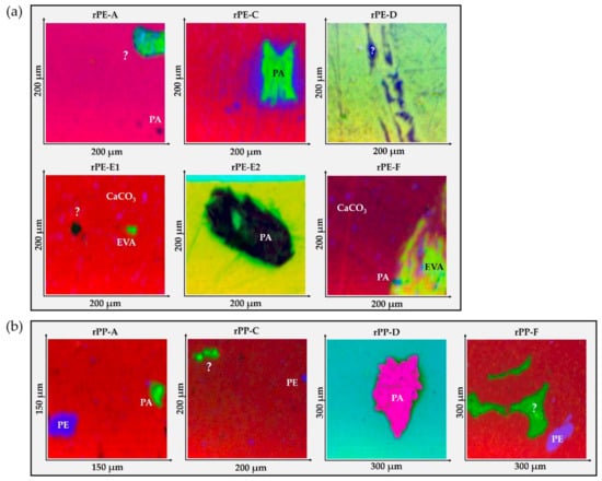 The following are available online at https://www.mdpi.com/article/10.3390/polym13101574/s1, Figure S1: ATR-FTIR imaging of rPE-A sample 1, Figure S2: ATR-FTIR imaging of rPE-A sample 2, Figure S3: ATR-FTIR imaging of rPE-C sample 1, Figure S4: ATR-FTIR imaging of rPE-C sample 2, Figure S5: ATR-FTIR imaging of rPE-D sample 1, Figure S6: ATR-FTIR imaging of rPE-D sample 2, Figure S7: ATR-FTIR imaging of rPE-E1 sample 1, Figure S8: ATR-FTIR imaging of rPE-E1 sample 2, Figure S9: ATR-FTIR imaging of rPE-E2 sample 1, Figure S10: ATR-FTIR imaging of rPE-E2 sample 2, Figure S11: ATR-FTIR imaging of rPE-F sample 1, Figure S12: ATR-FTIR imaging of rPE-F sample 2, Figure S13: ATR-FTIR imaging of rPP-A sample 1, Figure S14: ATR-FTIR imaging of rPP-A sample 2, Figure S15: ATR-FTIR imaging of rPP-C sample 1, Figure S16: ATR-FTIR imaging of rPP-C sample 2, Figure S17: ATR-FTIR imaging of rPP-D sample 1, Figure S18: ATR-FTIR imaging of rPP-D sample 2, Figure S19: ATR-FTIR imaging of rPP-F sample 1, Figure S20: ATR-FTIR imaging of rPP-F sample 2.