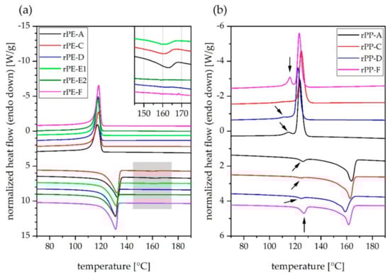 DSC curves of (a) rPE and (b) rPP materials, respectively. Upper curves are obtained from cooling scans, lower curves from second heating scans. Image (a) contains a magnification of the PP melting temperature range (grey area) in the upper right corner. Curves have been stacked and shifted arbitrarily along vertical axis to enhance comparability. Endothermal direction is down.