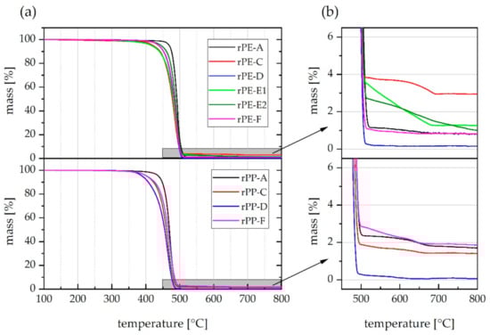 Pyrolysis curves obtained from TGA. (a) Entire temperature range, (b) magnification of the second decomposition step after polymer backbone degradation. Curves of rPE materials are shown in the upper half of (a,b), while curves of rPP materials are shown in the lower half. One representative curve is shown per material grade.