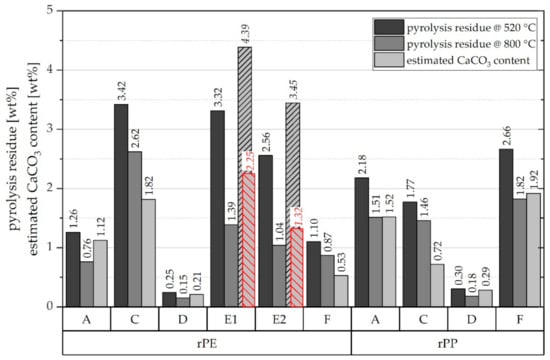 Usually, carbon black should remain unaffected in a TGA conducted under pyrolytic conditions, i.e., with nitrogen as a purge gas. However, the carbon black might have reacted with residual oxygen in the pyrolysis residue or it might have been sucked off from the open ceramic crucible leading to the observed linear loss of mass. A consecutive flushing with pure oxygen for 10 min at 800 °C resulted in a very moderate further loss of mass of 0.13 and 0.30 percentage points down to 1.23 and 0.74 wt.% for rPE-E1 and E2, respectively, compared to the residual mass at 800 °C in nitrogen. Taking these new values and assuming they represent CaO (the residual solid product of CaCO3 decomposition) would result in more plausible estimates of the CaCO3 contents of 2.25 and 1.32 wt.% for rPE-E1 and E2, respectively. These values are illustrated as red dashed bars in Figure 7. However, the real CaCO3 content could be lower than that due to the presence of other thermally stable inorganic compounds. This uncertainty is a disadvantage of using the final residual mass instead of the delta m between 520 °C and 800 °C.